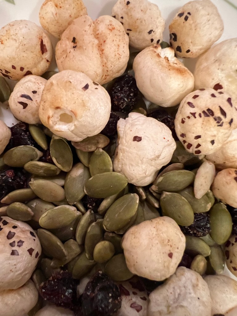 This Makhana Trail mix with pumpkin seeds and craisins is a wholesome crunchy snack that both nutritious and delicious. This 3-ingredient trail mix has roasted makhana (fox nuts), which are light with a satisfying crunch. The nutty flavor from the pumpkin seeds and the sweet-tart pop of craisins balances the flavors and textures.Its a good substitute popcorn for a movie night snack.