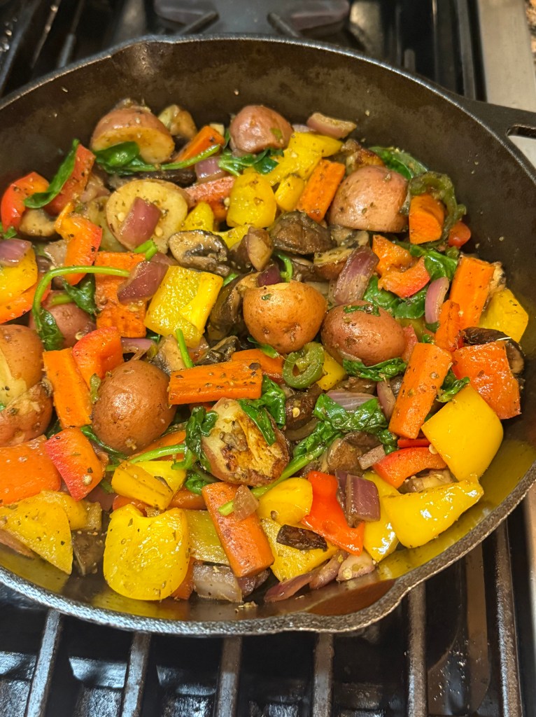 3. Then add in the onions, Jalapeno’s, mushrooms, peppers and spinach, cook for 2 minutes and add the roasted potatoes back in the skillet.