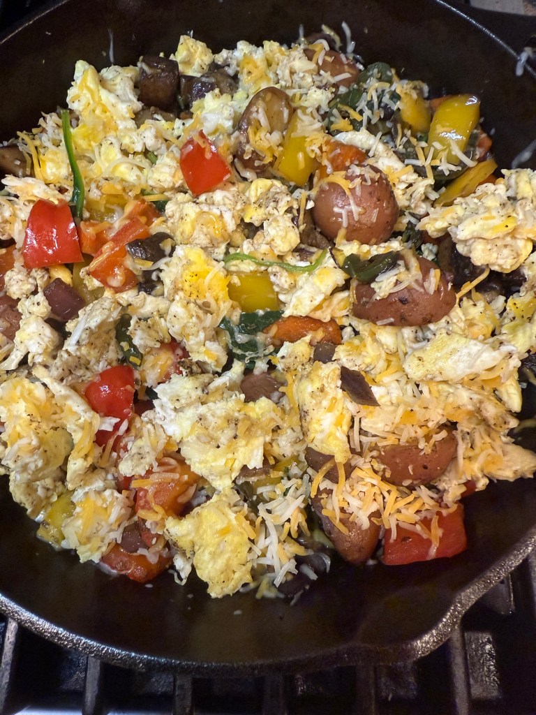 I saute the baby potatoes first until they are crispy on the outside and tender inside. Then I add all other vegetables. A colorful medly of bell peppers, onions, mushrooms, jalapenos, cherry tomatoes and spinach is then tossed in. Then I add a few slices of avacado for some healthy fats and mix in the fluffy cooked eggs.